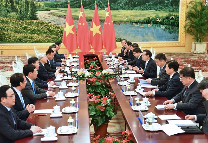 李克强表示,中越是山水相连的近邻。昨天,习近平总书记同阮富仲总书记举行了坦诚深入的会谈,达成重要共识。中方始终本着相互尊重、平等互利的原则,坚持与邻为善、以邻为伴的方针发展同越南的关系,愿不断深化两国政治互信,深入推进各领域交流合作,筑造更加坚实的互利共赢合作关系。