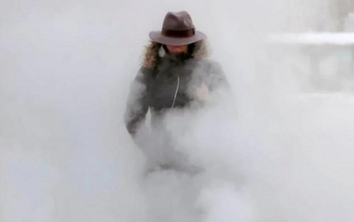 在罗马尼亚首都布加勒斯特,当地气温将至摄氏零下20度,一名女子从地下通风口冒出的蒸汽中穿过。