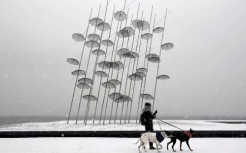 希腊北部港口城市塞萨洛尼基,一名女子在雪中遛狗。