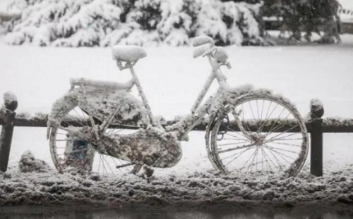 在德国西部城市威斯巴登,一辆自行车被积雪包裹了起来。