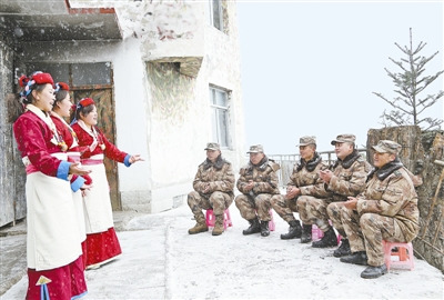 1月3日,本报“新春走军营”记者来到海拔4000多米、建在悬崖峭壁之上的西藏军区山南军分区拉则拉哨所。同去慰问的3位藏族姑娘不顾纷飞的大雪,在哨所前唱起了藏族歌,跳起了藏族舞。歌声夹着雪花,少见外人的战士们很开心。