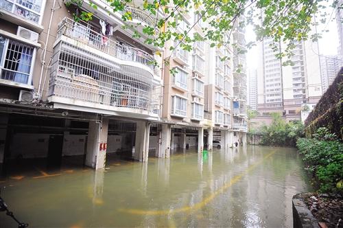 昨日下午1时30分左右,记者来到明秀东路80号翠竹苑小区时,很多业主正围在停车场附近议论。记者发现,该地下停车场位于一个斜坡下方,里面还停放着几辆私家车,通道被积水浸泡,不断发出恶臭气味。而在小区高处,已停靠了大批小轿车。