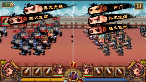 《洪荒之力》创新地采用了分屏的方式来展现战斗,敌我双方战前左右分列,战斗打响,弩兵先发齐射、弓兵箭如雨发、步兵集结推进、骑兵全力冲刺,四大兵种在将领的率领下激烈对抗,双方动态一览无遗!武将装配传说中的兵刃,释放酷炫的技能,对敌方阵营进行大面积的扫荡。分屏,呈现了战场上的一切细节!