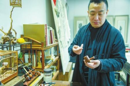 这个鸟笼托盘里随意放了几十只烟斗,作画的时候马勇就随意取出一只来抽上一斗。