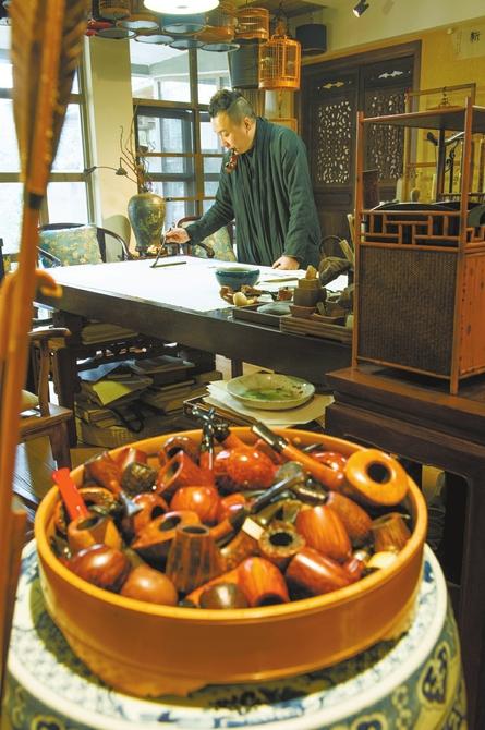 这是成都一群烟斗客的聚会,马勇算是里面的极品爱家,他个人就藏有上百只好斗。