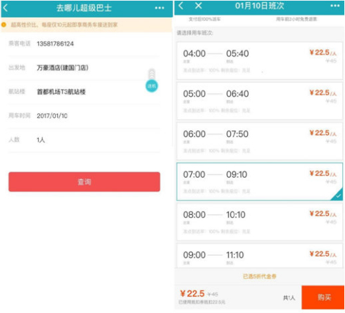 记者通过扫码进入超级巴士小程序后,无需注册登录去哪儿网的系统,便可以直接进入超级巴士页面。用户填写好联系电话、用车时间以及人数后,便可进入预订页面。在预订页面中,会出现不同时间段的用车班次,用户根据自身的需要选择车次点击购买,通过微信支付完成预订。预订成功后,用户将收到去哪儿网短信,将订单信息发送给用户。