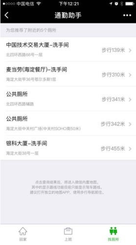 除了提供路况订阅功能外,“通勤助手”还惊喜的推出了“找厕所”功能。为用户提供定位点周边步行距离在500米范围内的洗手间列表,以及各自的地址。确保用户可快速步行到达。