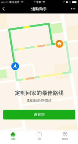 该小程序主要包括实时路况订阅与找厕所两大亮点功能点,一次设置家公司就可快速获得到家到公司的最佳路线,更能一键获取周边厕所,使用简洁方便。