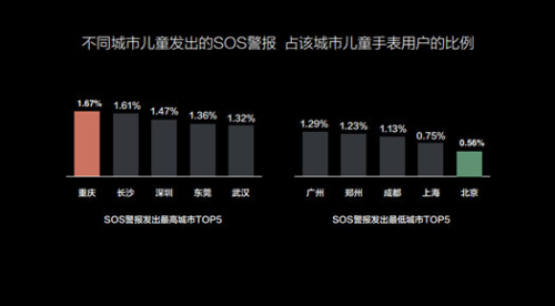 在安全这一重点领域,具有紧急SOS呼叫功能的360儿童手表针对全国各大城市SOS警报数据进行了分析后发现,北京的安全状况最好,仅有0.56%的360儿童手表用户发出过SOS警报。而重庆则为警报发出数量最多的城市,为1.67%。