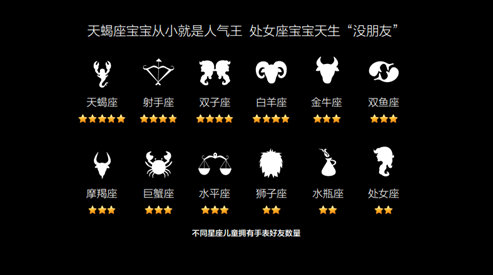 星座和孩子们的性格有关吗?大数据显示,天蝎座宝宝的好友数最多,处女座宝宝的好友数最少。看来在培养孩子社交能力的时候,家长们也要适当留意一下自己孩子的星座了。