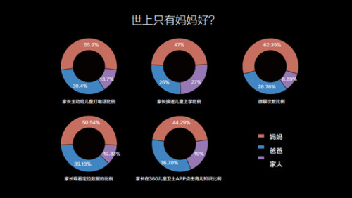 “世上只有妈妈好,有妈的孩子是个宝”。在接送孩子上下学、查看孩子定位、在360儿童卫士APP点击育儿知识比例,以及与孩子使用儿童手表“微聊”的次数上,妈妈同样在家长中排名第一。