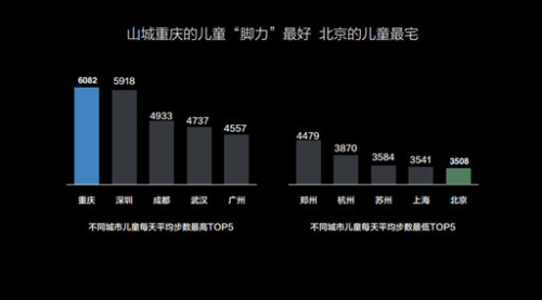 孩子的运动状况直接关系到身体的健康。通过360儿童手表的计步功能可以发现,各大城市中,山城重庆的孩子以平均每天6082步的“超凡”运动量超过其他城市,而北上广等一线城市则排名靠后,北京孩子平均每天只运动3508步。人们的出行习惯、交通发达程度、每天活动安排等都在影响着孩子们的运动量。