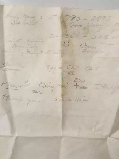 为了来中国,夫妻二人还学习了简单的中文,包里的一张纸上写着“不要”、“鸡蛋”、“谢谢”、“请你”等词语的中文发音。