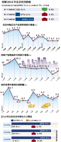 新京报讯 (记者沙璐)昨日,北京市统计局、国家统计局北京调查总队发布了2016年北京市经济运行情况。2016年北京市经济平稳健康发展,全年实现地区生产总值24899.3亿元,按可比价格计算,比上年增长6.7%,与全国GDP增速相同。