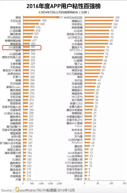据统计,2016年12月微信、今日头条、QQ、网易新闻、UC浏览器、腾讯新闻、开心消消乐、哔哩哔哩动画、搜狐新闻、360浏览器为App用户粘性“百强榜”前十位,其中360浏览器远超劲敌QQ浏览器和手机百度,挺进前十位,在月度使用时长上与搜狐新闻相差仅2分钟。
