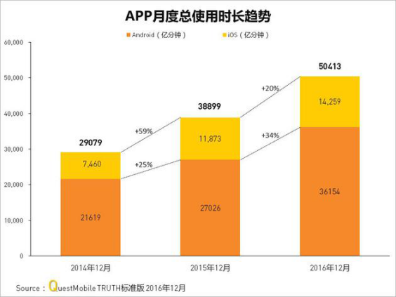 此外,App月度总使用时长持续增长,数据惊人。2014年12月用户总使用时长为29079亿分钟,2015年为38899亿分钟,到了2016年用户总使用时长高达50413亿分钟,可见App已占据用户大量时间。