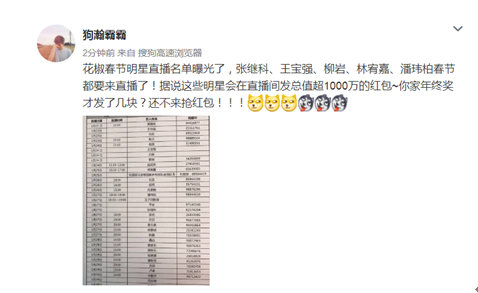据曝光的微博网友表示,这份名单人数有近50位明星,明星的阵容还在陆续补充中。此次偶像不仅是会直播给粉丝拜年,还会给粉丝发红包,消息一经曝光,便引来众多明星的粉丝疯狂转发。有粉丝激动的表示:“真的要哭了!我偶巴要给我发红包啦”。