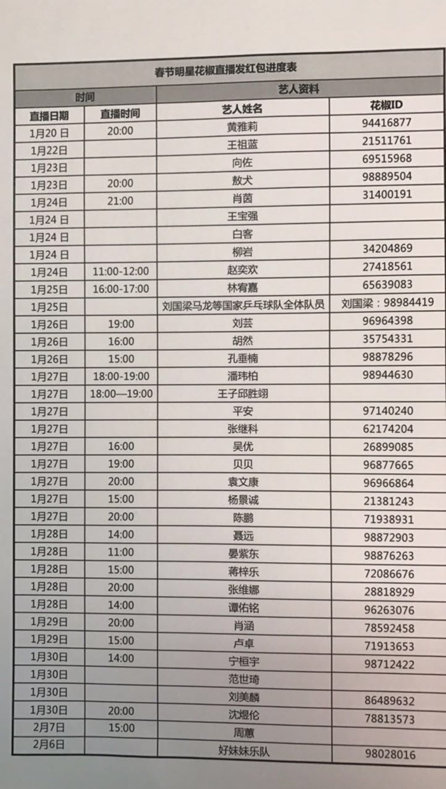 此前,花椒直播公布了春节1亿红包计划将在,1月27日至2月2日向用户发1亿的红包,最高金额1888元。虽然花椒早在11日就已经公布了明星将要到花椒直播并送出1000万红包的计划,但由于迟迟没有公布具体的明星名单,不少网友不得不翘首以盼。即便如此,这份来自微博网友的“直播进度表”依然真伪难辨。不过,从张继科、王祖蓝等明星曾在花椒多次直播来看,似乎这份名单真实性颇高。