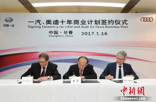 中新网1月17日电 16日,中国第一汽车集团公司(以下简称中国一汽)与奥迪股份公司(以下简称奥迪公司)在长春正式签署《一汽、奥迪十年商业计划》。