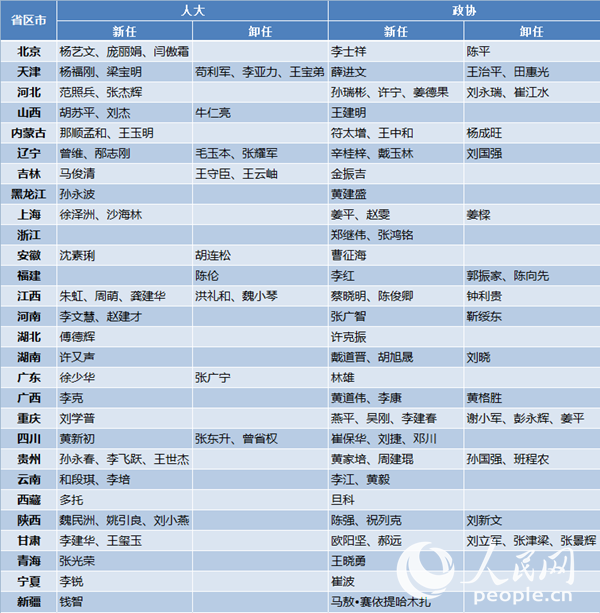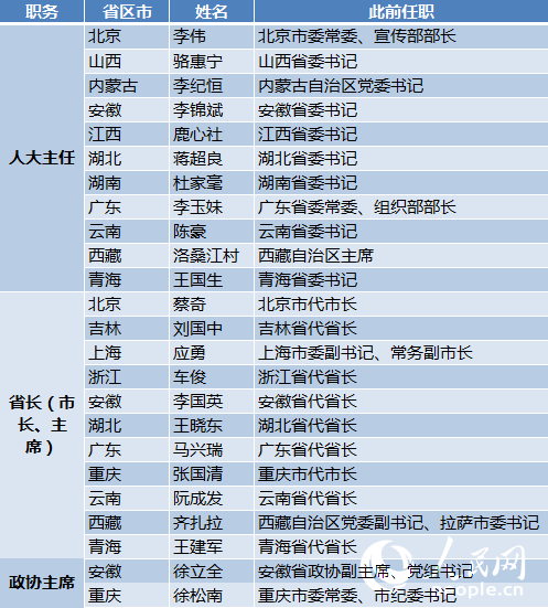 2017地方两会人大省级四套班子主要领导调整(截至2017年1月23日)