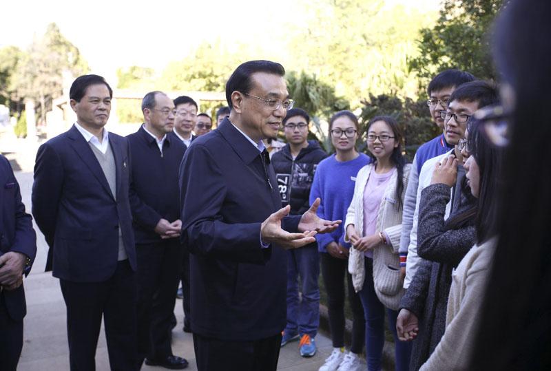 【李克强:你们要将西南联大精神发扬光大】李克强24日来到位于云南师大的西南联大旧址。寒假仍留校的学生们闻讯赶来。总理说,你们现在的教学条件比当年好得多。当年是“物质上得不了,精神上了不得”。希望你们在这里汲取前辈们的精神养分,传承刚毅坚卓的文化品格,将西南联大的精神发扬光大。