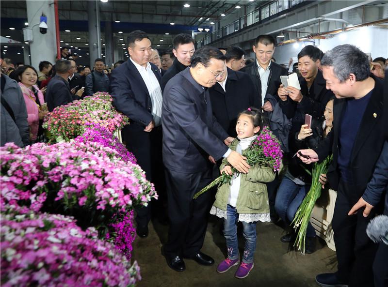 【总理夜访昆明花市:关心起早贪黑的花农】春节将至,昆明斗南花卉市场内鲜花汇成七彩海洋。24日晚,总理意外到访,让这个人头攒动的市场沸腾了。李克强仔细询问鲜花品种价格,关心花农收入,还自掏腰包买了两束花。总理说:“你们起早贪黑、辛苦劳作,给全国人民送去欢乐吉祥。我祝福你们春节快乐!”