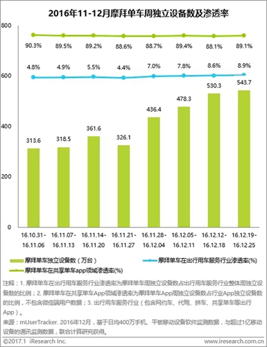 此外,去年12月末,摩拜单车的周活跃设备量已达543万台,比两个月前增长73%,同样居行业首位。