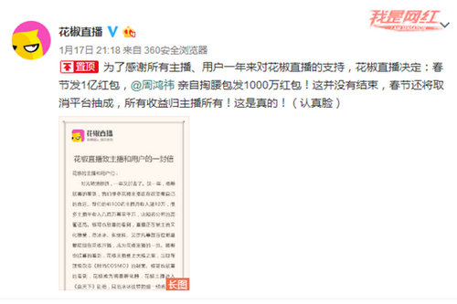中新网1月18日电 1月17日,花椒直播发布长微博《花椒直播致主播和用户的一封信》,以此表达对广大花椒平台主播和用户感谢,并宣布花椒直播将在春节期间发1亿的红包,同时还透露360董事长、花椒直播投资人周鸿祎也将自掏腰包拿出1000万人民币在春节期间为用户发红包。