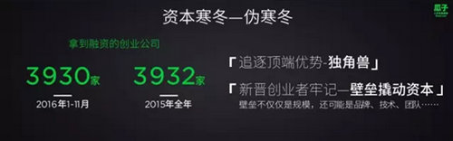 第一个,我们的看法管它叫伪寒冬,这也是在投资圈非常热的话题。实际上,过去一年里,资本规模还是充足的。比如,很多基金在过去一年拿到了很多的钱,基金的数量也比之前多了很多。但更多的公司在想要融资的时候却发现得到的反馈非常冷淡,融资变得比以前更加艰难。相比之下,真实的情况是,一些好的项目却拿到了非常多的钱。