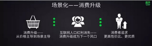 第三个,场景化,可以说是消费升级的产物,也是去年讨论的最多的,很多创业公司是围绕这个机会在做的。