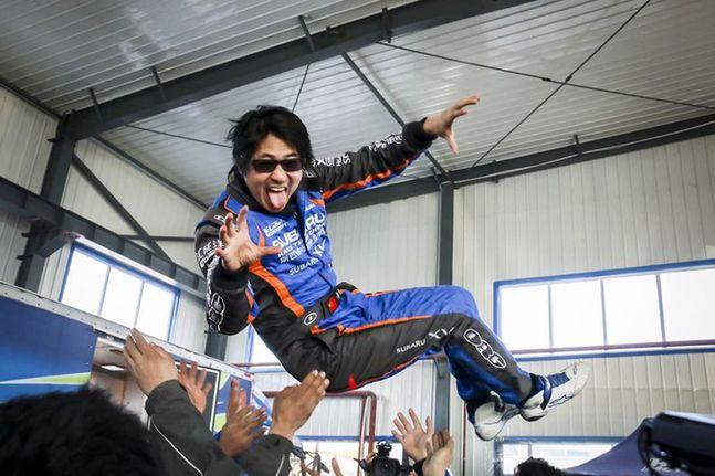 队友祝贺斯巴鲁中国拉力车队韩寒勇夺年度总冠军。