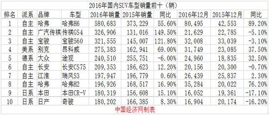 在顶住了合资的大举反攻后,自主SUV逐渐稳住阵脚并再获突破。2016年全年,SUV销榜前十中,自主SUV占据六席,继续包揽冠亚季军。选车网数据显示,2016年,自主SUV共计销售5299881辆,占SUV总销量的58.6%,市场份额接近六成。