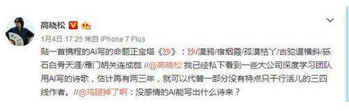 在携程小诗机上线之前,已经有不少名人开始关注携程的AI写诗程序。知名娱乐人高晓松就曾在微博上晒出了一首用携程AI写的命题诗《沙》,高晓松表示:“从这篇诗歌来看,已经颇有意境。估计再有两三年,就可以代替一部分没有特点只干行活儿的三四线作者。”