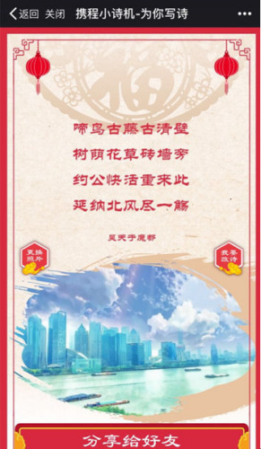 中新网1月24日电 古有曹植七步成诗,今有AI为你写诗。恰逢春节来临,携程上线了一款名为 “携程小诗机—为你写诗”的有趣产品,用户只要上传风景照,便可一键成诗。产品刚刚上线,便吸引了数百万人体验,写诗拜年成了一股新风潮,刷爆了朋友圈。