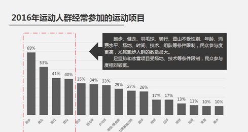 跑步、健走、羽毛球、骑行、登山不受性别、年龄、消费水平、场地、时间、技术、组队等条件限制,民众参与度更高,尤其跑步人群的基数最大。足篮排和冰雪项目受场地、技术等条件限制,民众参与度相对较低。
