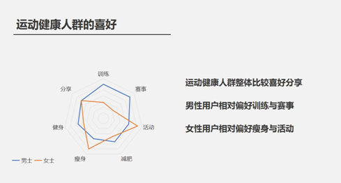 运动健康人群整体比较喜好分享,男性用户相对偏好训练和赛事,女性用户相对偏好瘦身和活动。