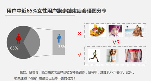 用户中近65%女性用户跑步结束后会晒图分享,晒娃、晒美食、晒自拍这老三样已被晒跑步,晒马甲,炫腹肌PK下去了。此外,被关注和“点赞”也是自己坚持下去的动力!