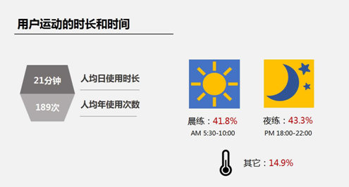 报告显示,运动人群主要时间集中在傍晚18:00~22:00之间,晨练人群其次。