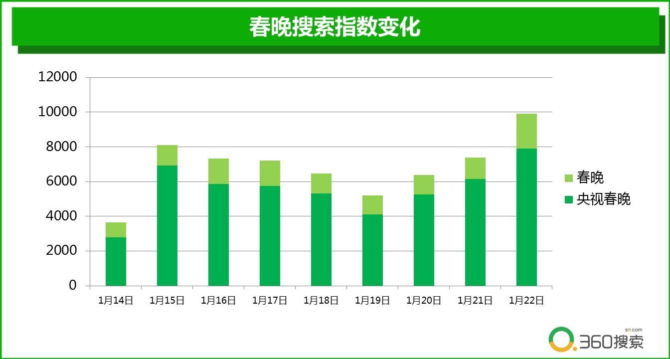 春节期间360搜索数据显示,“春晚”一词的搜索量在1月15日出现第一次急剧增长,随后几天稍有下降趋势,并从1月20日小年前后再次呈现爆发性增长。究其原因,15号的第一次增长,可能与央视靳伟在微博上曝出了春晚节目单有关,而第二次搜索指数的上升,则是因为除夕临近春晚进入最后彩排准备阶段,更多用户希望能够对春晚阵容、节目安排等做到心中有数,更合理的安排观看时间,也更方便能关注到自己心仪的节目。