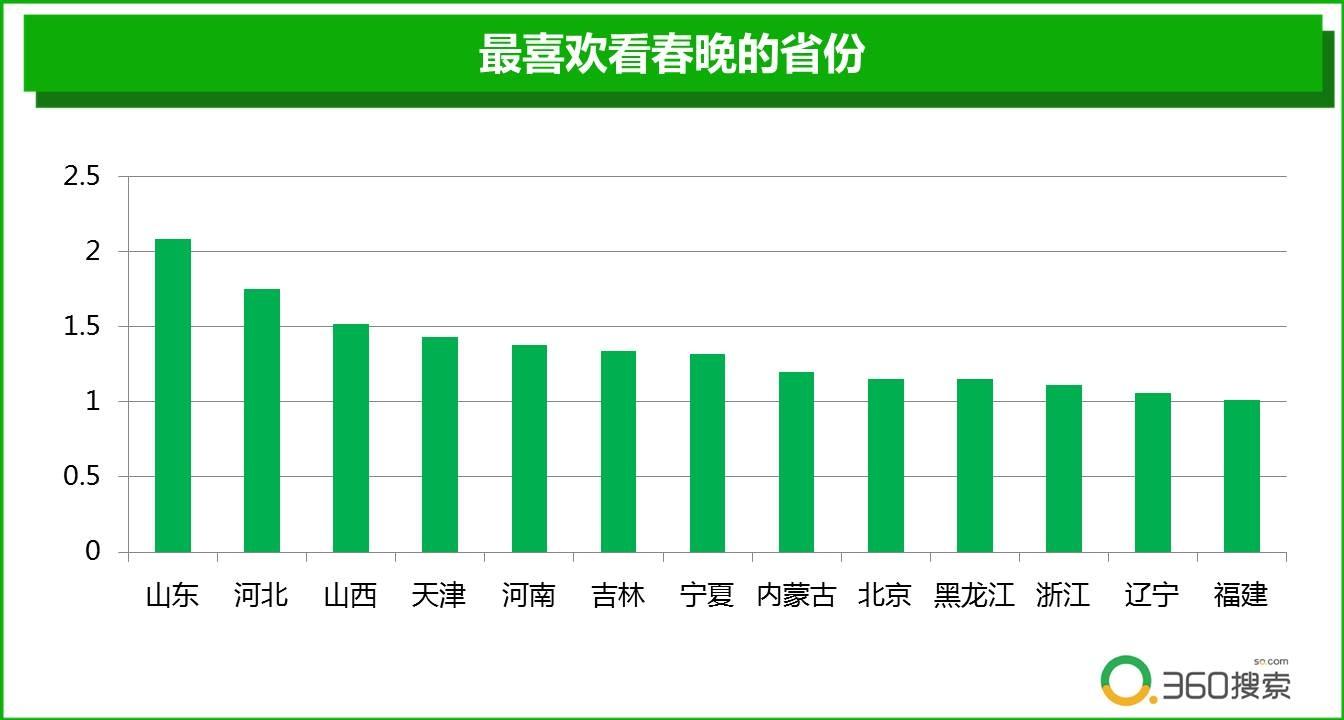 最爱看春晚的省份数据同时验证了“最爱看春晚地区“的数据。在偏爱春晚的省份中,山东、河北、陕西等省份都属于北方,而福建、浙江属于华东地区。结论同样也是:北方省份观众更爱看春晚。