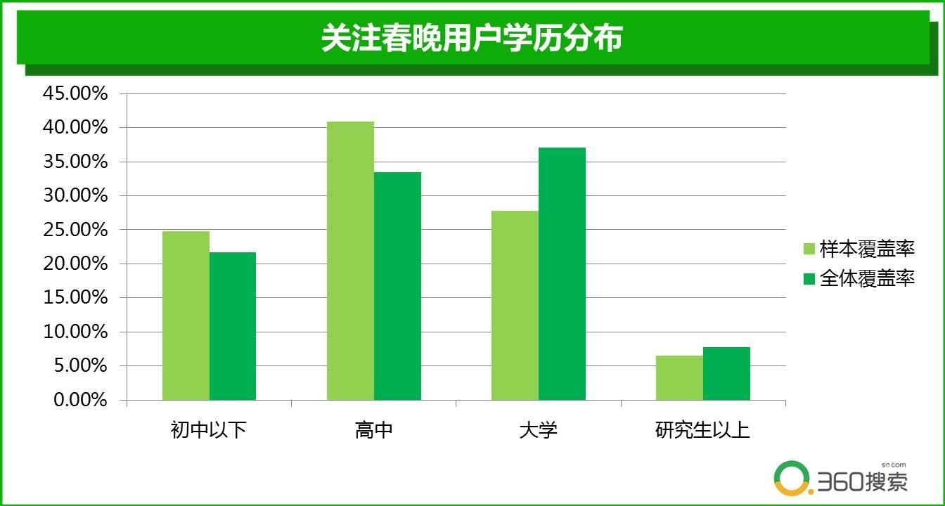 除此之外,用户的学历分布也与其对春晚的关注度有着千丝万缕的联系。根据360搜索指数,关注和搜索“春晚”的用户中,高中学历和初中学历的比例,明显高于正常初中和高中学历分布,而大学和研究生以上学历的比重明显偏低。