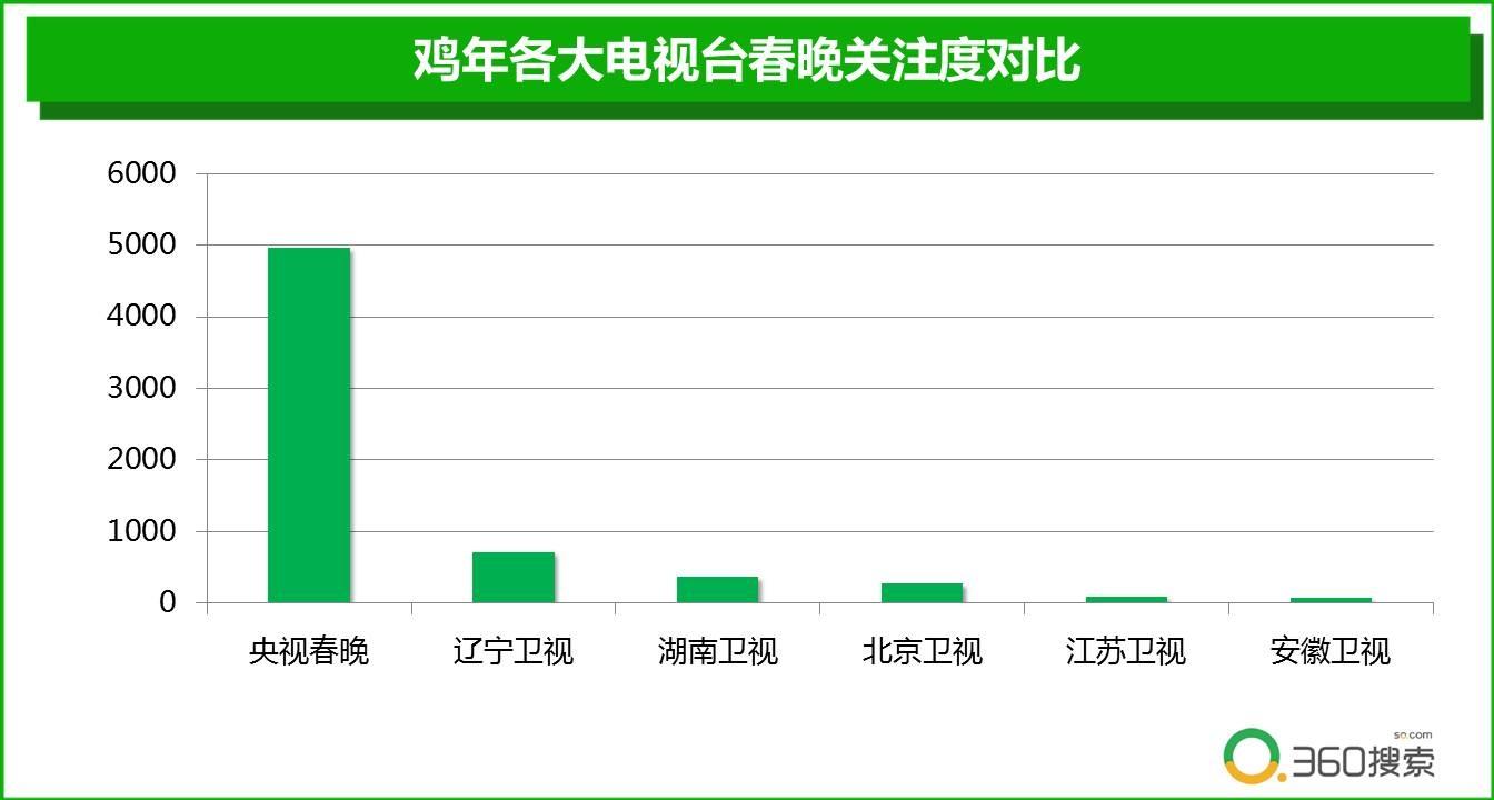 除了央视春晚,其实近些年一些地方媒体,也都在积极筹备春晚,并将于除夕到初二的时间段内陆续推出。春节期间360搜索数据显示,“央视春晚” 尽管辽宁卫士、湖南卫视、北京卫视等卫视电视台都有各自精彩的春晚节目,但央视春晚仍是全国人民除夕夜最重要的“一道主菜”,其搜索指数远超其他卫视春晚节目。