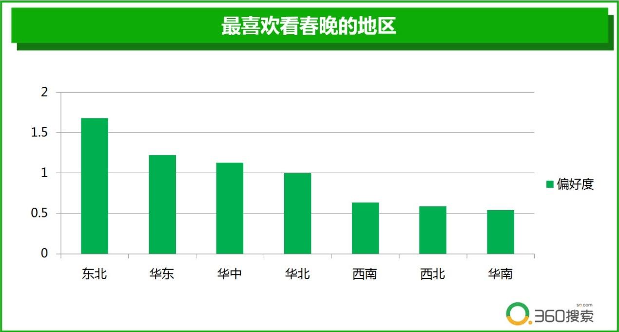根据360搜索大数据,观看春晚的用户中,东北、华东和华中等北方用户更加偏爱春晚,偏爱度超过基准值,而西南、西北、华南的用户,对春晚的关注显然不如北方。