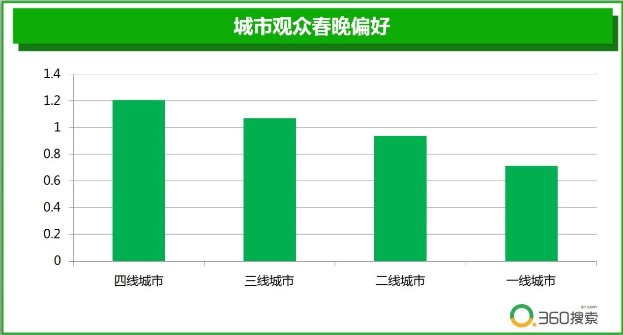 地域方面,城市观看春晚的偏好,与城市大小相关。360搜索大数据显示,一线城市的观众,不如三四线城市更关注春晚。