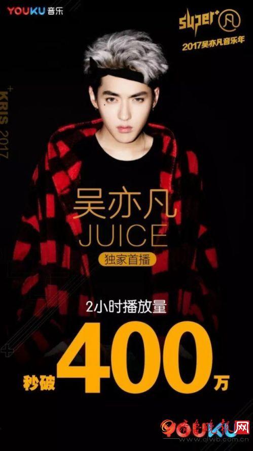 吴亦凡最新单曲《Juice》MV已独家登陆优酷自频道,上线2小时播放量便突破400万,成为优酷增速势头最强劲的MV,24小时播放量破千万。随着MV热度的飙升,吴亦凡官方自频道也迎来60多万粉丝订阅,优酷“2017吴亦凡音乐年”第一弹打出相当可喜的成绩。