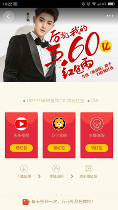 俗话说“不发现金的红包拜年都是耍流氓”,这次黄子韬要发真的现金红包了!据小编了解,今年春节,黄子韬、贾乃亮、马丽、李光洁、江铠同、甘婷婷、迪丽热巴等当红明星大咖将与360手机助手联手,分别在大年三十、大年初一和正月十五壕送3.6亿的现金红包。所有抢到的红包均为现金红包,并且都可以通过360手机助手进行提现,堪称红包界的一股清流!