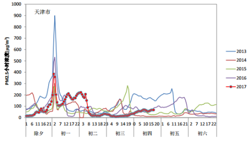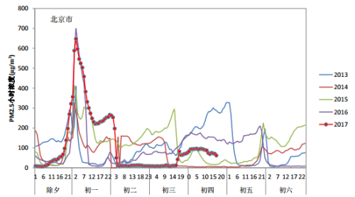 分析表示,2013年至2017年除夕至初六,京津冀及周边地区受烟花爆竹集中燃放影响较大,北京、天津、石家庄等城市除夕夜间PM2.5小时浓度快速上升,PM2.5小时峰值浓度较18时分别增高8.7倍、6.3倍和4.4倍。