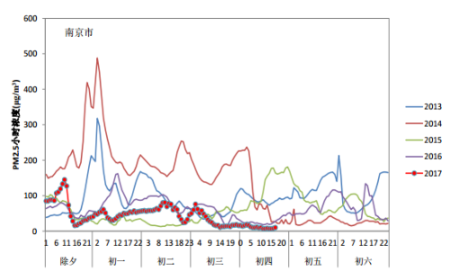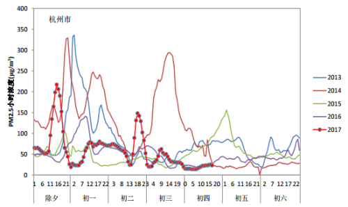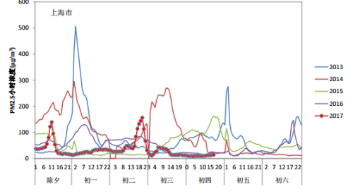 不过,在这5年春节期间,上海、南京、杭州、太原等实施禁放限放措施的城市在除夕夜间PM2.5浓度均未出现明显上升现象,和本地未禁限放的年度相比大幅下降。2017年除夕18时至初一6时,上海、南京、杭州和太原PM2.5平均浓度分别为17、44、39和115微克/立方米,比2013年至2015年同期分别下降90%、78%、77%和42%。