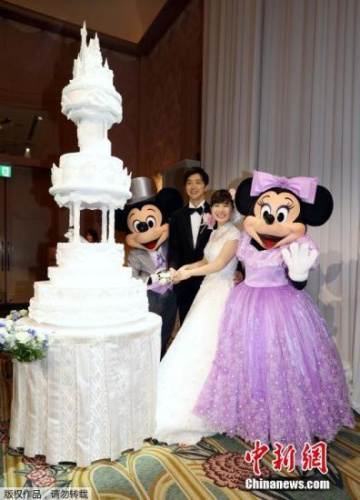 当天,去年9月结婚的福原爱身着纯白婚纱,在米老鼠等动漫人物的簇拥下切开蛋糕。婚礼上还介绍了两人相遇时身穿运动服的照片等。