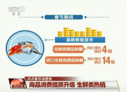 传统年货、绿色食品等商品热销。健康饮食观念带动地方土特产、时令水果、保健礼品等商品销售大幅增长。电商平台的数据显示,春节期间,生鲜类商品热销,同比增长接近4倍,进口生鲜销量更是同比增长超过14倍。